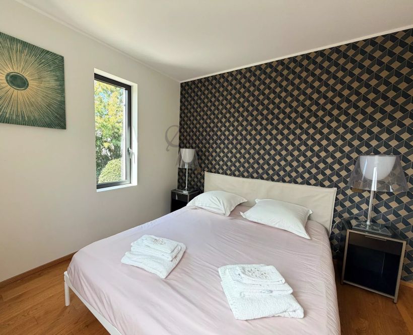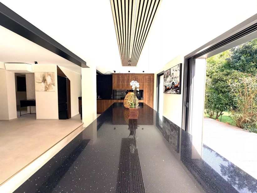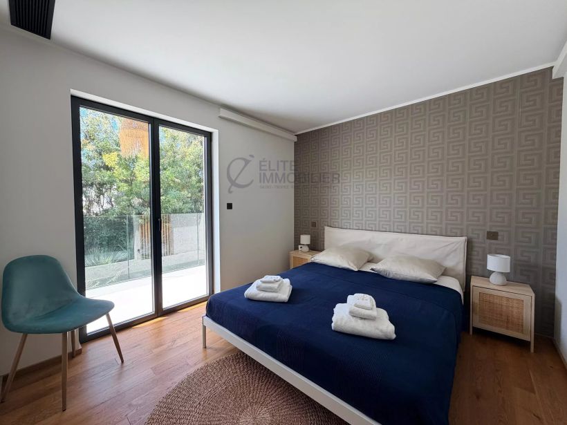 Hidden from view, this modern and peaceful villa offers a large equipped kitchen opening onto a spacious living room of 70m2, opening onto a heated pool facing south.