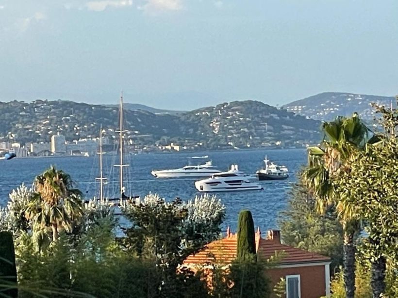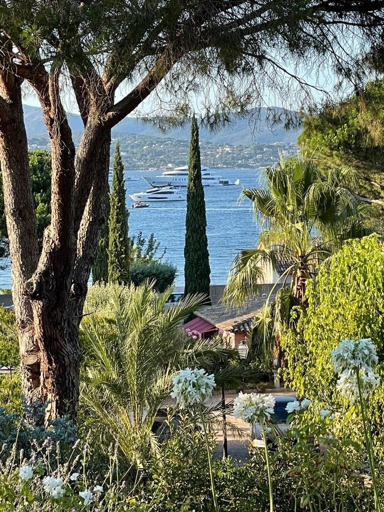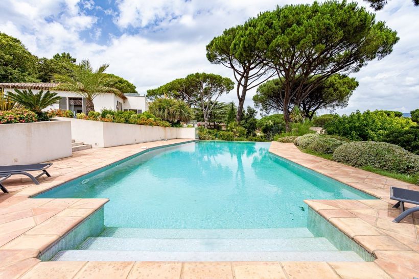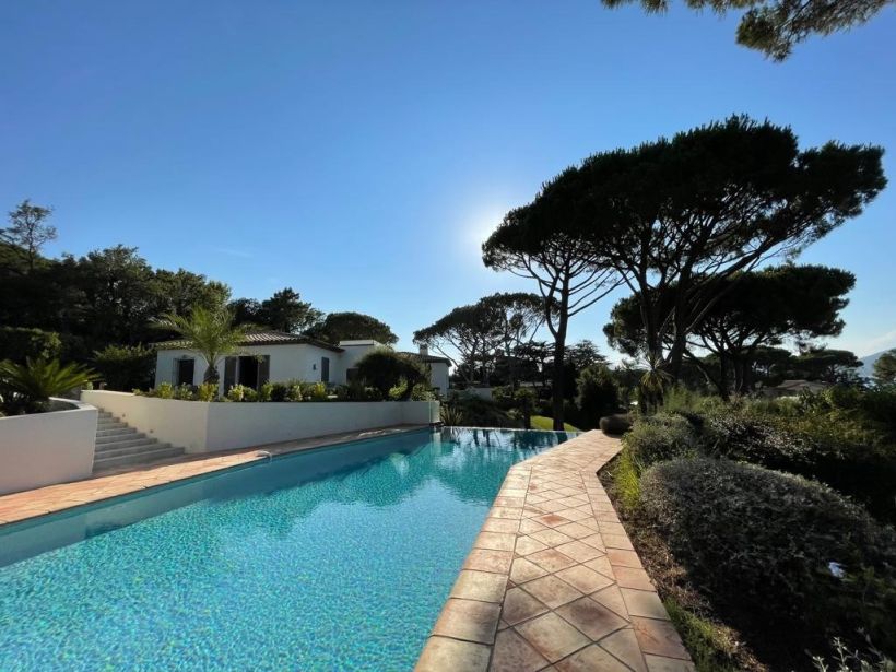 A quelques minutes de la plage et du village de Saint-Tropez, très belle villa vue mer de 350 m² entièrement rénovée édifiée sur un terrain de 3200 m² arboré de belles essences méditerranéennes.